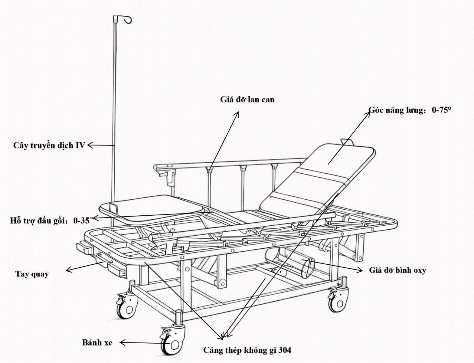 - Ba tay quay điều chỉnh chiều cao của cáng và góc đầu gối tựa lưng.